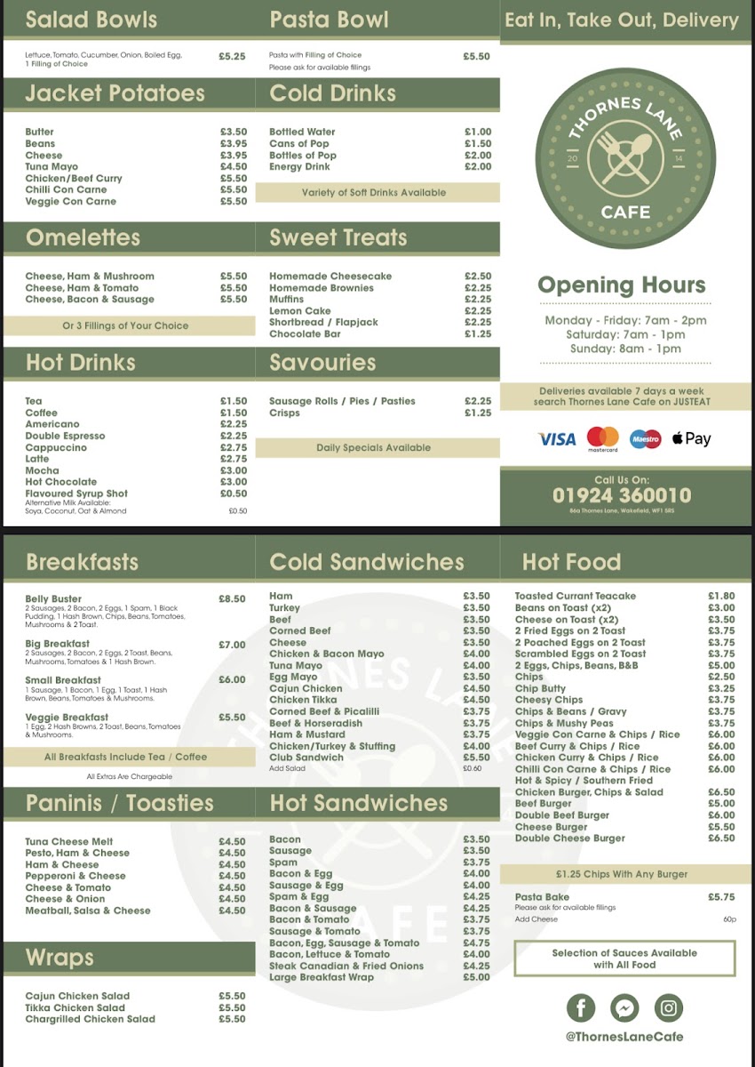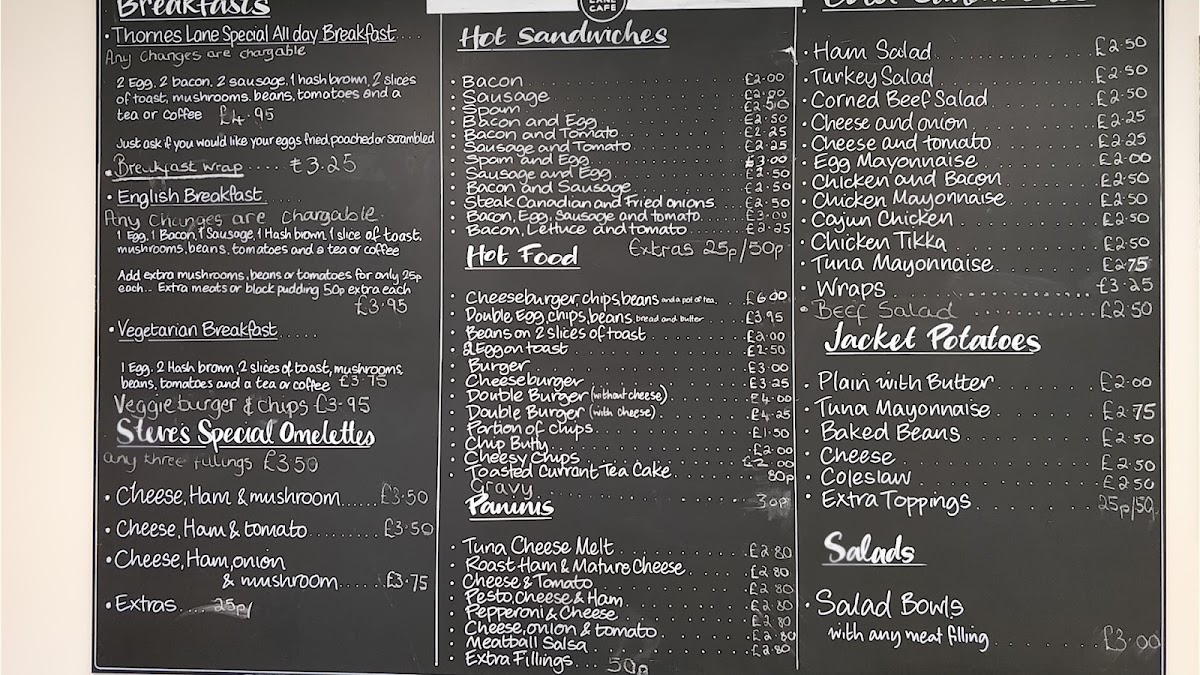Thornes Lane Cafe offers a diverse menu that caters to a variety of tastes, whether you're looking for a hearty breakfast or a light snack. Their Belly Buster Breakfast and Big Breakfast are great options for those looking to start the day with something substantial, while the Veggie Breakfast provides a satisfying choice for vegetarians. For a quick bite, the Bacon Hot Sandwich and Sausage Hot Sandwich are popular choices, alongside other tasty options like the Hash Brown Hot Sandwich and Spam Hot Sandwich. If you're in the mood for something warm and melty, the Tuna Cheese Melt or Pepperoni & Cheese Panini are sure to hit the spot. The Jacket Potatoes, such as the Tuna Mayo Jacket Potato and Chicken Curry Jacket Potato, are a comforting and filling option. For those with a sweet tooth, the Homemade Cheesecake and Raspberry Chocolate Muffins from the TLC Treats section are delightful desserts to finish off the meal. There are also various savory snacks available, including Sausage Rolls and Sausage Pies, perfect for an on-the-go treat. Whether you're stopping by for a refreshing Americano or a cold Pepsi, Thornes Lane Cafe has something to satisfy every craving.